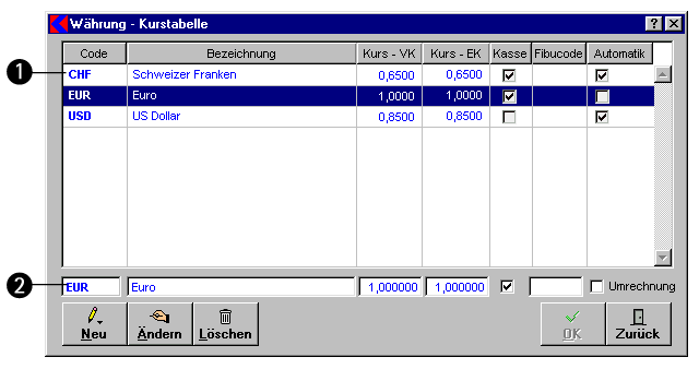 - Hier können Sie nach Klick auf die Schaltfläche Ändern die ausgewählte Währung ändern oder nach Klick auf die Schaltfläche Neu eine neue Währung eintragen.