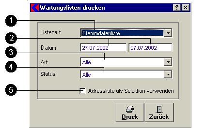 In diesem Fenster können Sie die Wartungsverträge als Stammdatenliste oder einer Bewertungsliste drucken.