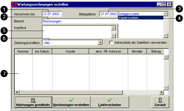 In diesem Fenster werden die offenen Wartungsrechnungen ermittelt und für die Abrechnung vorbereitet und erstellt.