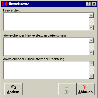 Hinweistext: In diesem Fenster können Sie Hinweistexte zu dieser Adresse erstellen. Für den Lieferschein und die Rechnung können Sie abweichende Texte eingeben. Immer wenn Sie einen neuen Beleg erstellen, kommt der hier eingegebene Hinweistext.