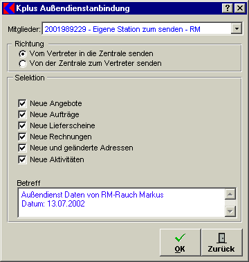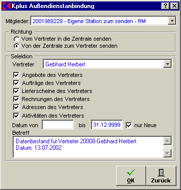In diesem Fenster werden die Daten, die für den Aussendienst benötigt werden, von der Zentrale zum Vertreter exportiert und importiert.
