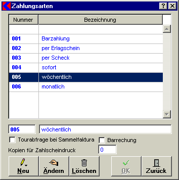 - Um eine Zahlungsart zu ändern, markieren Sie den zu ändernden Eintrag durch Anklicken und starten Sie die Bearbeitung mit einem Mausklick auf die Schaltfläche Ändern oder durch einen Doppelklick auf die ausgesuchte Zahlungsart. Nehmen Sie die gewünschten Änderungen vor und bestätigen sie durch einen Klick auf OK.