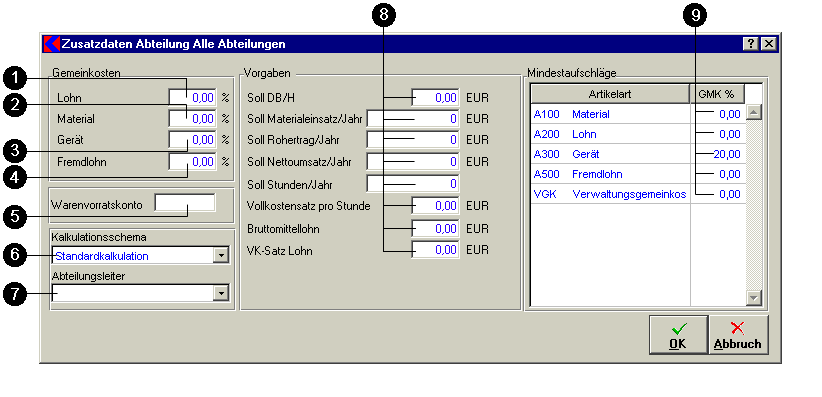 In diesem Fenster ist jede Abteilung mit Gemeinkosten, Vorgaben, Mindestaufschläge, Warenvorauskonto und Kalkulationsschema einstellbar.